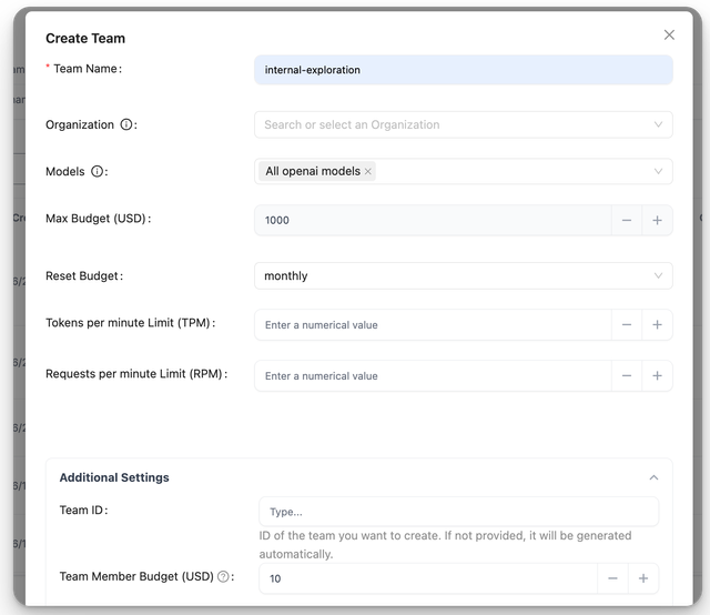 • max budget: The team max budget will ensure spend for the entire team never exceeds a certain amount.
